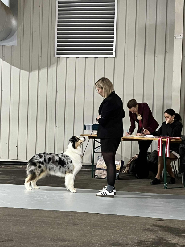 8,5 months - Very athletic elegant well balanced female - absolutly beautiful feminin head and expression - correct bite - exc physical shape - well developed correct body - moderate bone - exc feet - beautiful clear blue merle color - correct coat texture - converges correctly front and rear - good topline for age - exc rich and drive. la juge a ajouté après son classement que chacune des 4 femelles classées aurait mérité la première place.